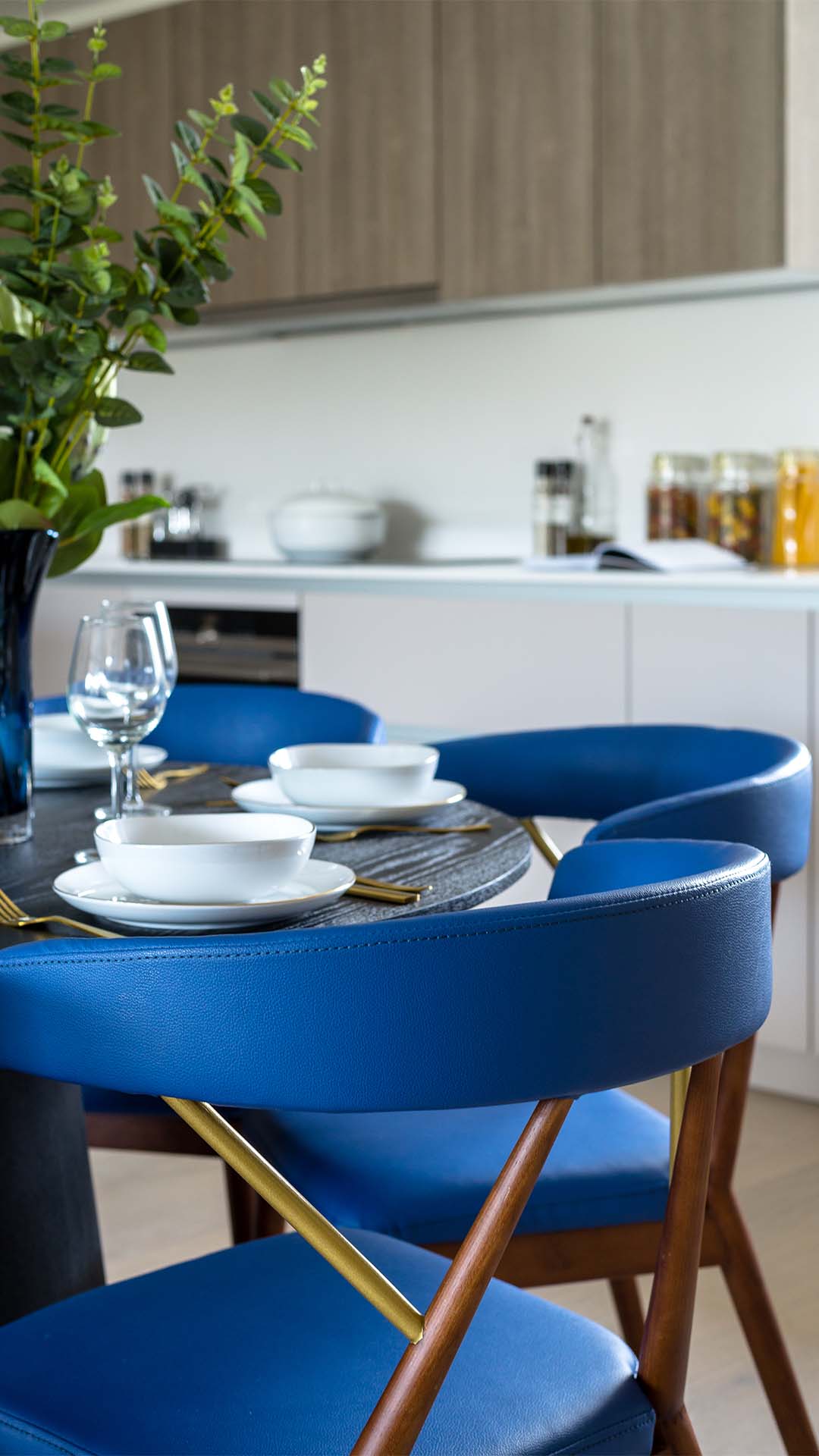 Cobalt blue chairs to oppose the rawness of the earthy furniture and features.