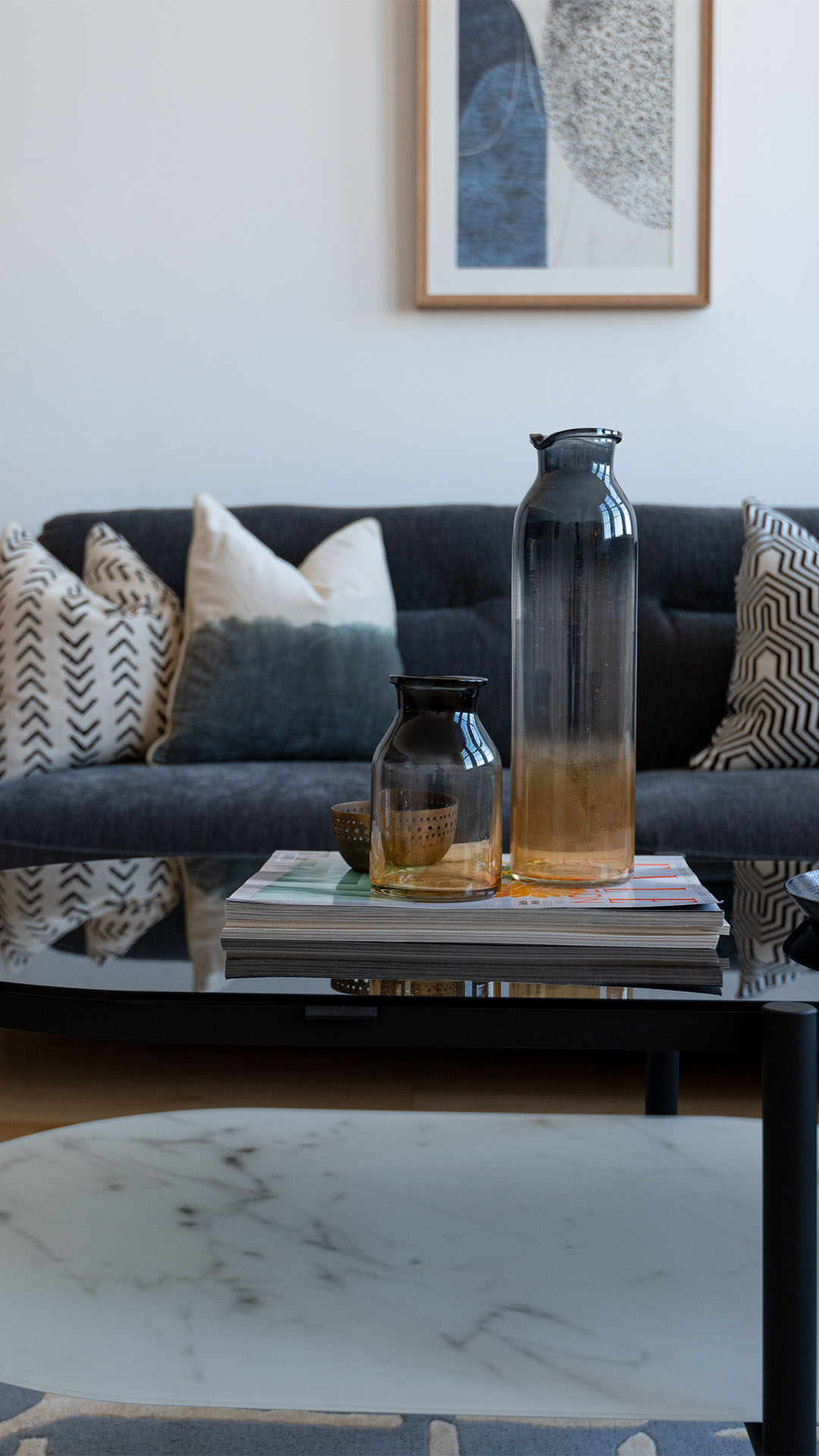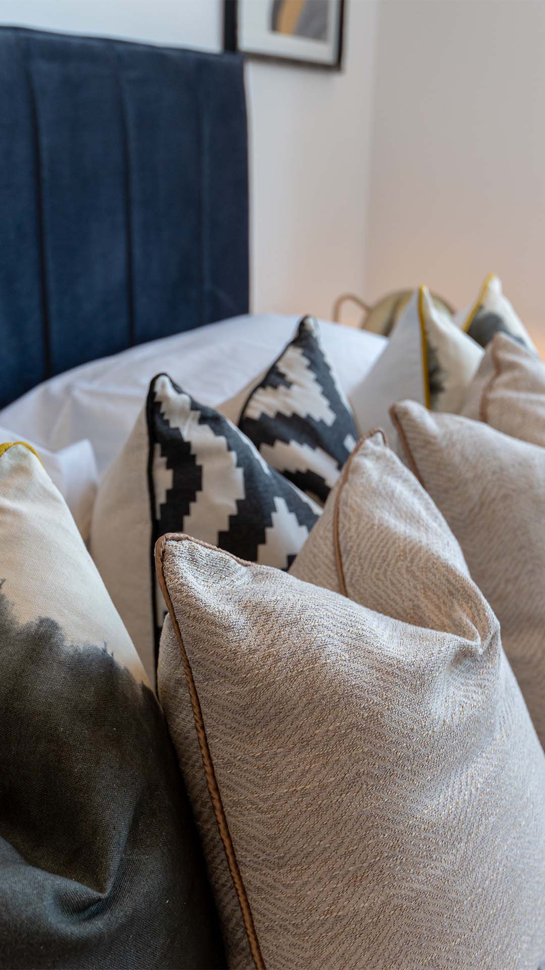 The client wanted a bachelor-pad but with a difference. A darker colour palette of blacks and blues contrasted with beiges achieved this. Rose opted for our full Diamond furniture package with accessories to achieve this option to give the apartment the ideal combination of sartorial splendour and understated elegance.