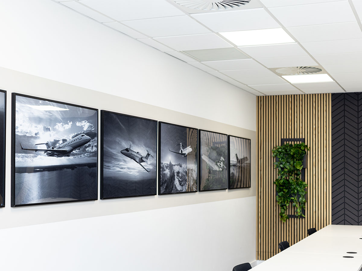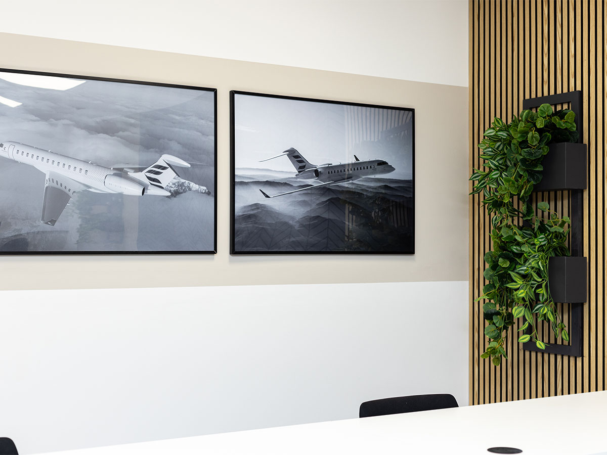 Custom-designed panelling introduced depth and texture, while a shift from stark white to warmer, neutral tones infused the rooms with a modern feel that mirrors Bombardier’s sophisticated colour scheme. - Contemporary Furnishings & Accents