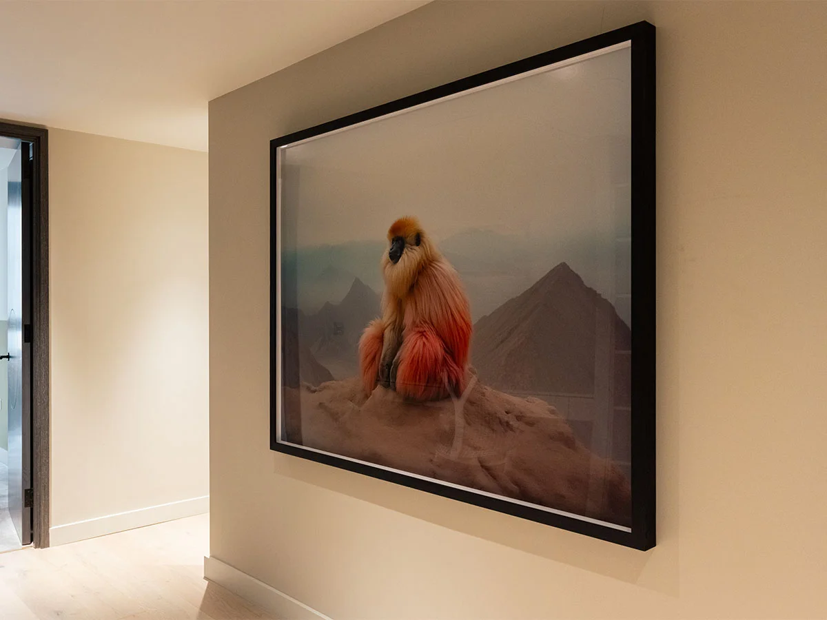 The artwork was handled with utmost care during its transportation. We strategically positioned the artworks to complement the design, ensuring they naturally become focal points—the large-scale, framed photograph of a golden langur anchors the hallway, while the vibrant bookshelf photograph adds playfulness and warmth to the living space with its rich spectrum of colours.