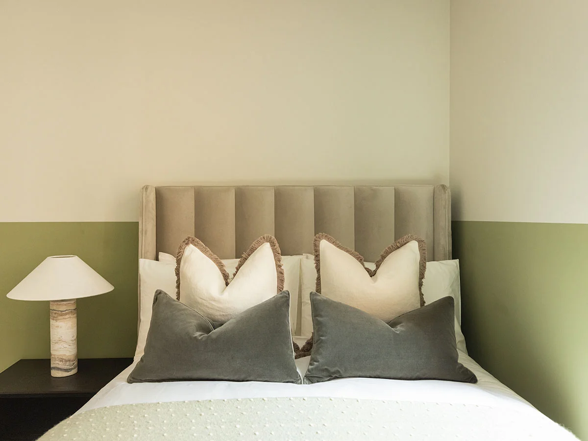 Our designer, Emma, curated a colour palette of soft greens, warm neutrals, and natural textures to add warmth to the space. For the